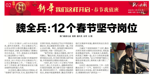 1月30日,荊門晚報頭條報道了市公交集團(tuán)10路線駕駛員魏全兵連續(xù)十二年春節(jié)堅守崗位,受到廣大市民朋友們紛紛點贊。