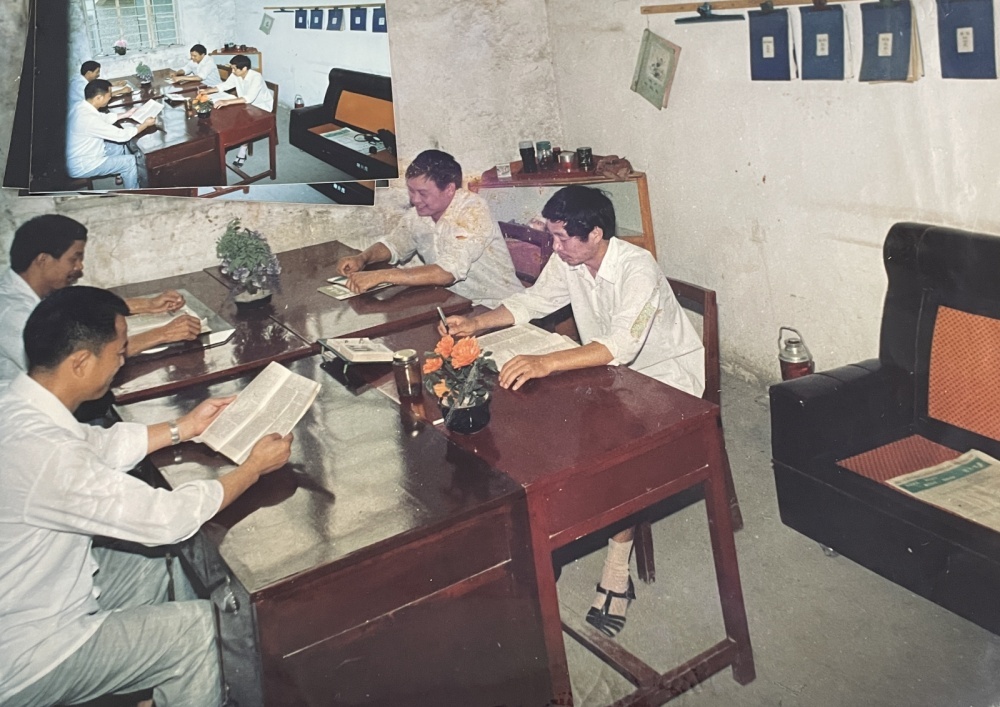 ▲80年代,機關辦公室工作場景。新舊都不一樣的四張桌子拼成一張大長桌,大家面對面圍坐著辦公。桌面上的兩盆鮮花植物,算是為數不多的裝飾。