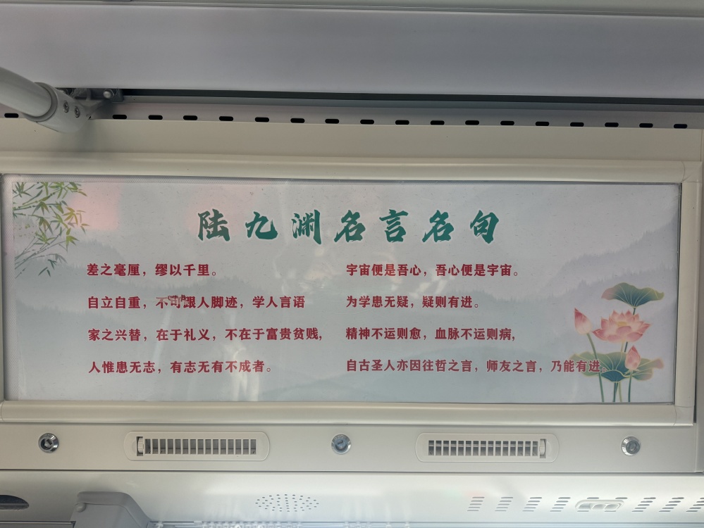 “陸九淵號(hào)”不僅僅是一條公交線(xiàn)路,更是一個(gè)移動(dòng)文化陣地。當(dāng)你踏上這趟公交車(chē),你會(huì)被駕駛員的熱情服務(wù)所感染,他們微笑著迎接每一位乘客,以?xún)?yōu)質(zhì)的服務(wù)彰顯著荊門(mén)的文化精神和城市溫度。車(chē)輛全部采用新能源公交車(chē),不僅環(huán)保節(jié)能,行駛起來(lái)也更為平穩(wěn),同時(shí),在車(chē)輛內(nèi)外裝飾以及“進(jìn)站、出站、溫馨提示”等場(chǎng)景語(yǔ)音播報(bào)融入陸九淵相關(guān)元素,讓乘客潛移默化的加深對(duì)荊門(mén)文化的認(rèn)識(shí)和理解。