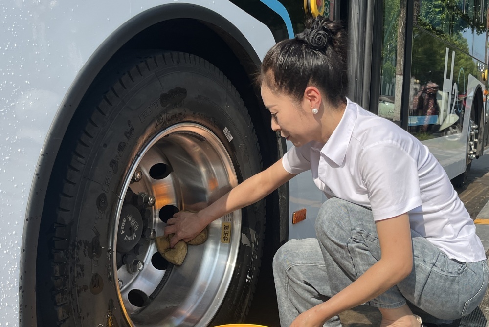 汗水濕透衣背,她細(xì)心擦拭著車輛的每一個角落,為乘客營造干凈舒適的乘車環(huán)境。