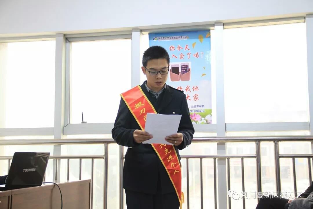 在當(dāng)天的表彰大會上,荊門市高新區(qū)·掇刀區(qū)政法委副書記朱曉紅、市公交集團有限公司副總經(jīng)理張忠林還分別結(jié)合“10·28重慶萬州公交車墜江事故”要求廣大公交駕駛員遵守職業(yè)道德,如何理性對待無理取鬧的乘客,遠離負能量的人。表揚聶聰聰在他人的財產(chǎn)找到嚴重危害時,義不容辭的出手相救,有效避免了他人重大財產(chǎn)損失,并號召要以身邊的時代楷模聶聰聰為榜樣,學(xué)習(xí)聶聰聰奮不顧身、見義勇為的高尚品質(zhì),要大力宣傳宣傳見義勇為先進,以先進的事跡感染人、吸引人,以崇高的精神激勵人、鼓舞人,用實際行動傳遞社會正能量,為平安掇刀創(chuàng)建作出新的貢獻。