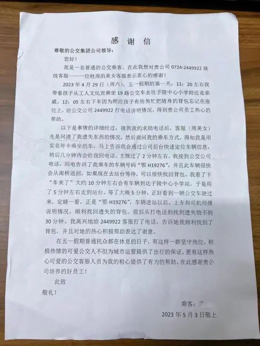 5月4日,小雨,一位熱心乘客走進(jìn)了荊門(mén)市公共交通集團(tuán)有限公司客服中心,送來(lái)一封溫暖的感謝信。信中,她向“五一”節(jié)假日期間堅(jiān)守崗位、積極熱心的公交人表達(dá)了濃濃謝意,紙短情長(zhǎng),字里行間流露出款款真情。